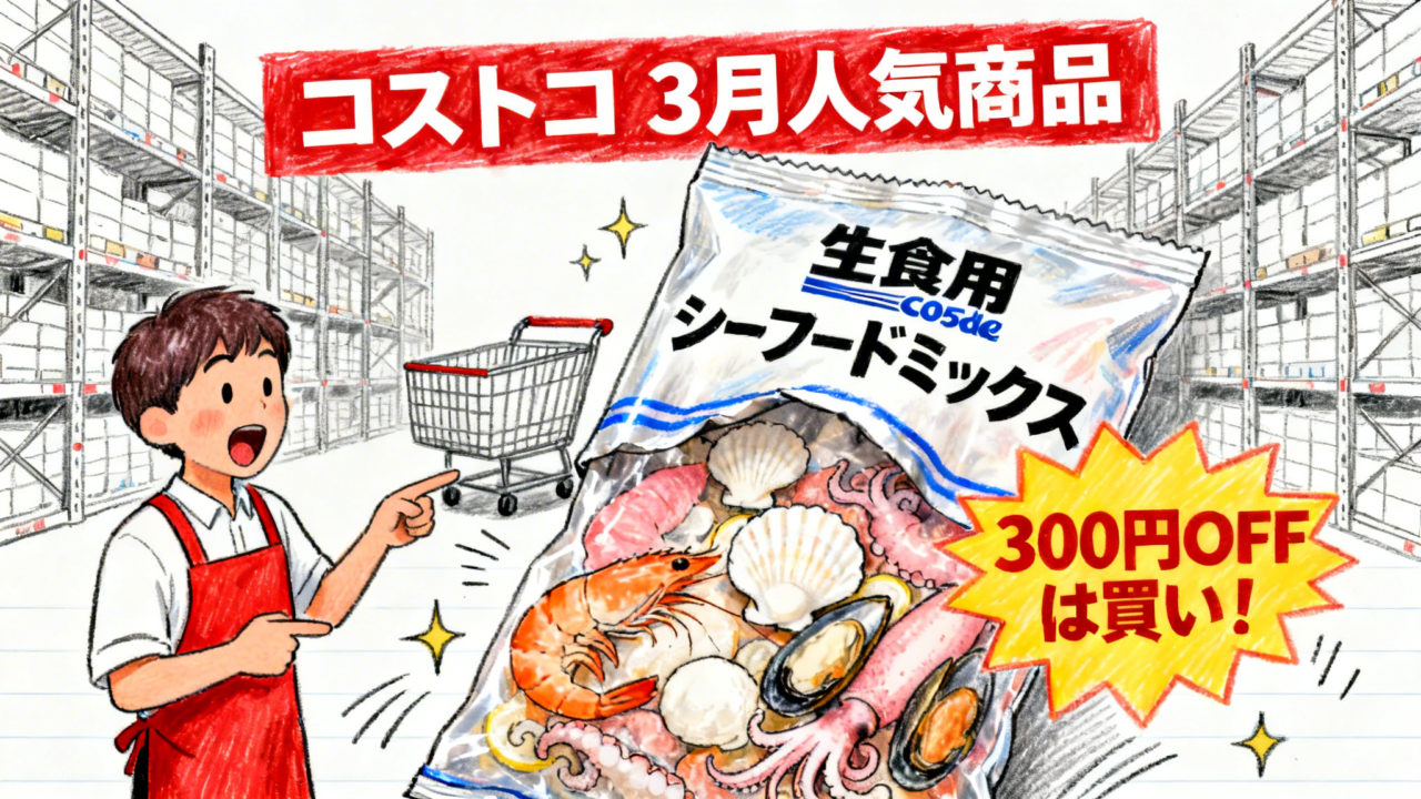 - 生食用 シーフードミックス 1kg:通常価格 ¥2,998 → 割引後価格 ¥2,698(~3/8まで)